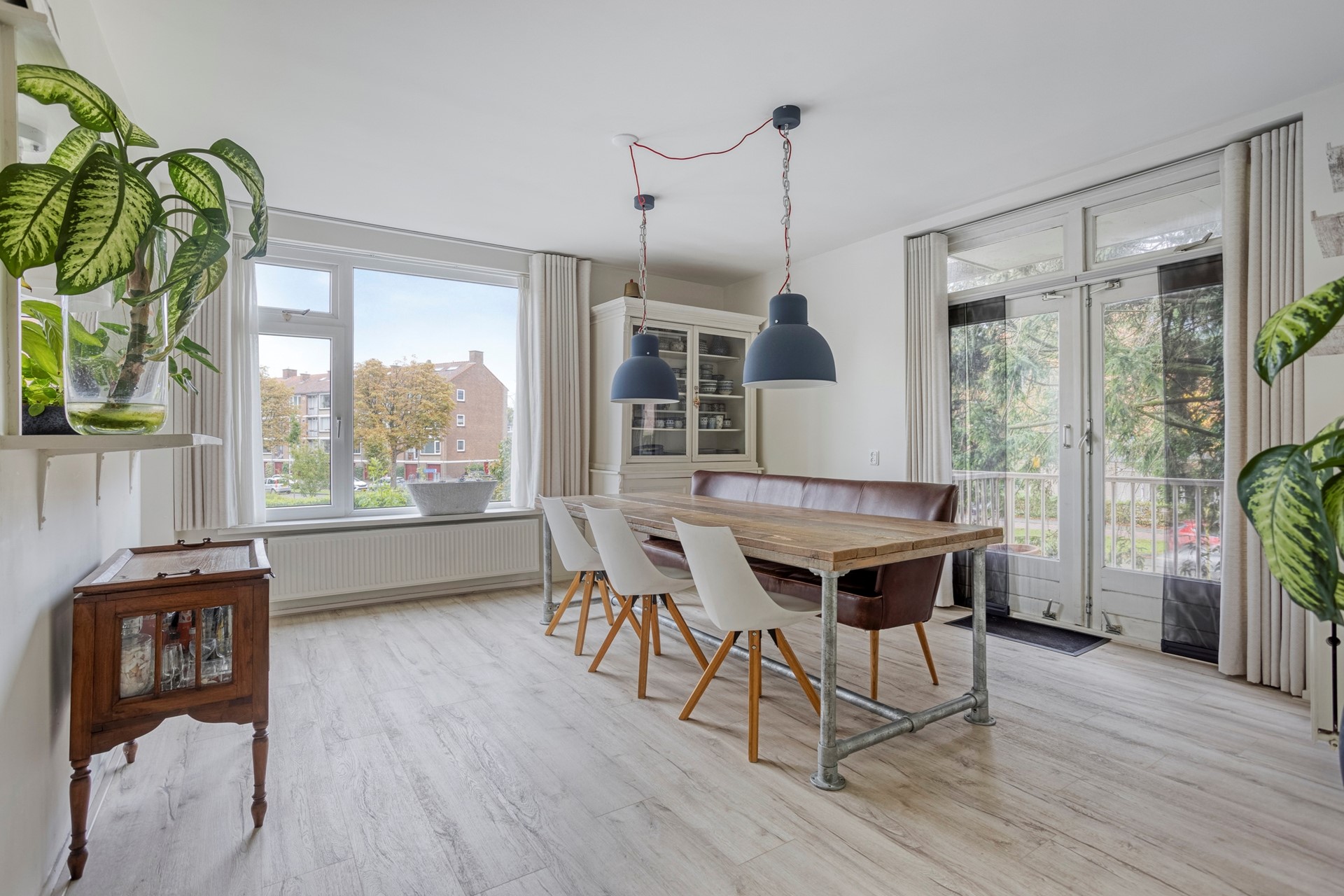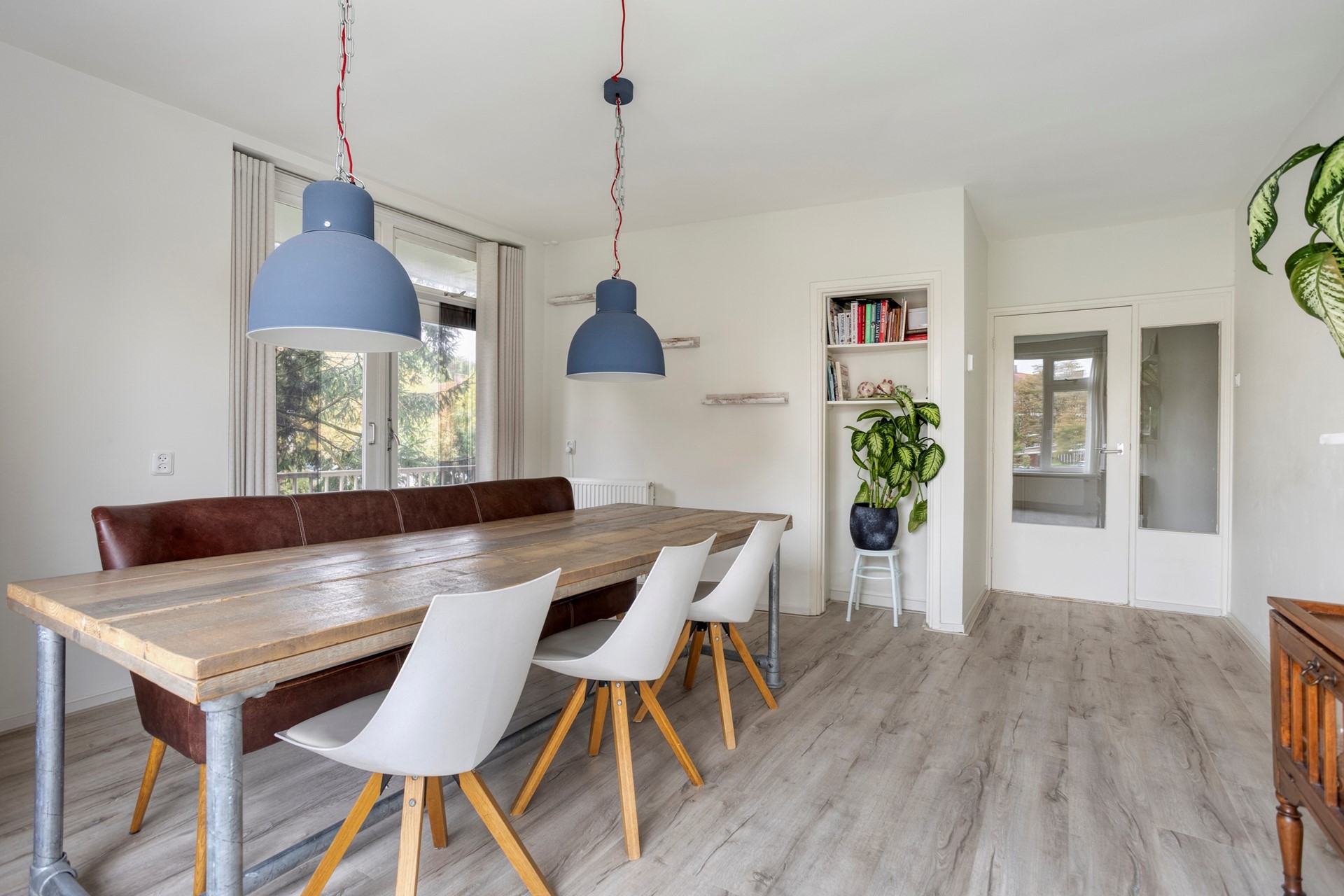 Heerlijke royale living welke bestaat uit een ruime eetkamer waar je heerlijk kunt tafelen of werken aan de grote tafel, voorzien van vaste kasten een aansluitend een fijne, knusse zitkamer/televisiekamer met eveneens een vaste kast. Via de dubbele openslaande deuren kom je op het fijne, ruime balkon.