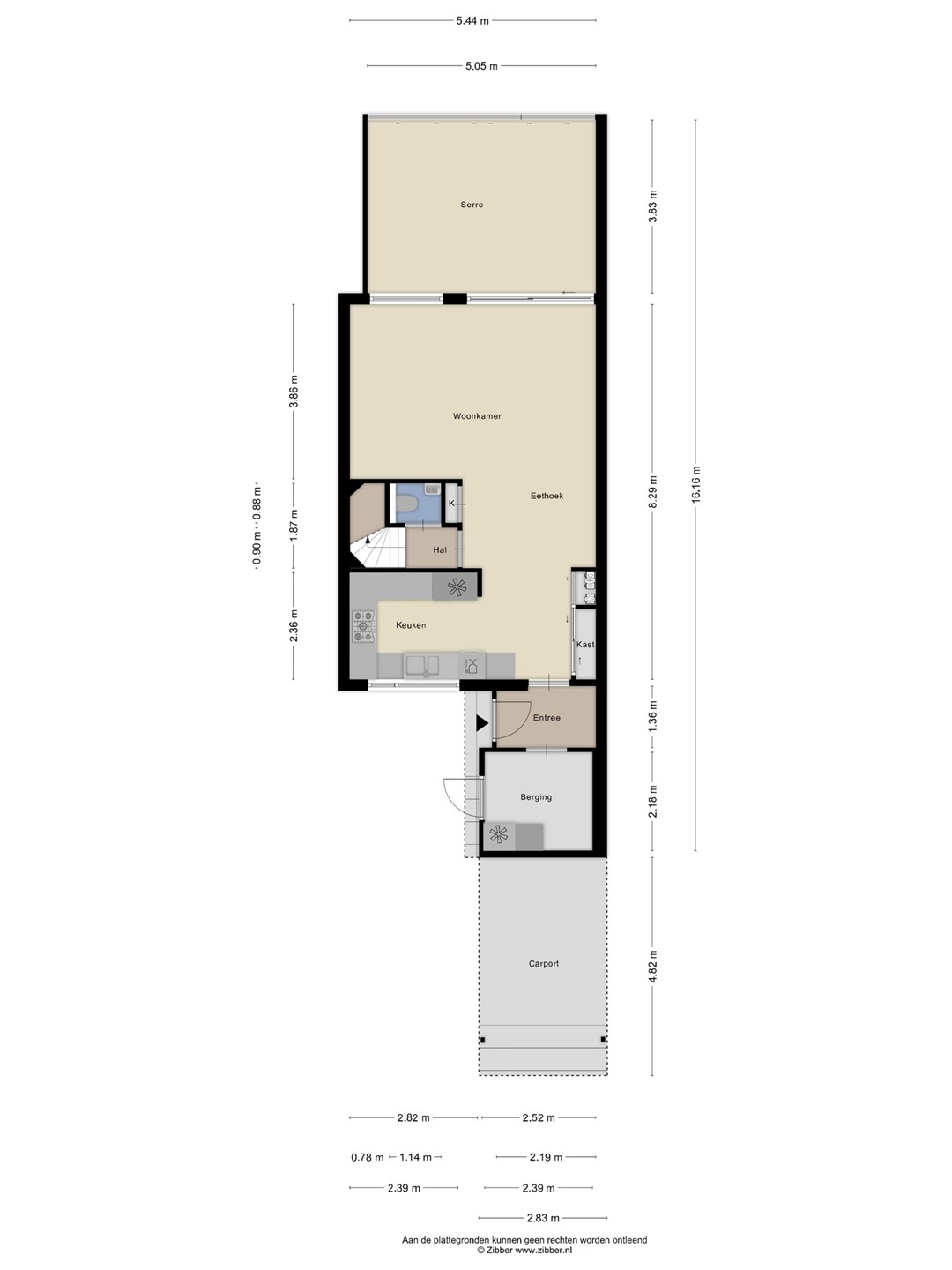 Indeling: carport en extra parkeerplaats voor de deur, entree naar de woning, hal, toegang tot de berging/bijkeuken.