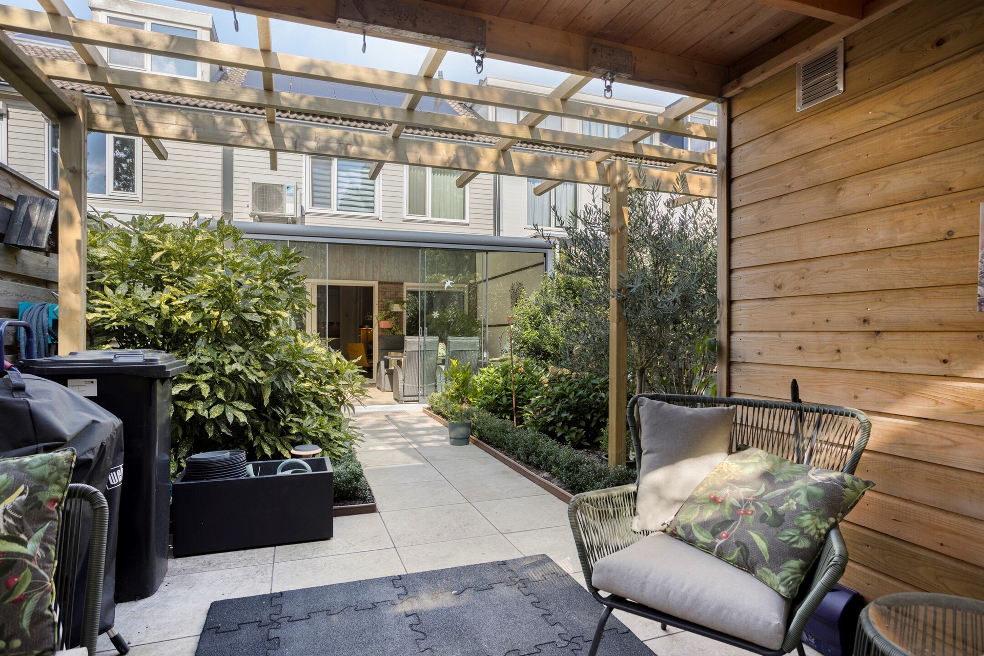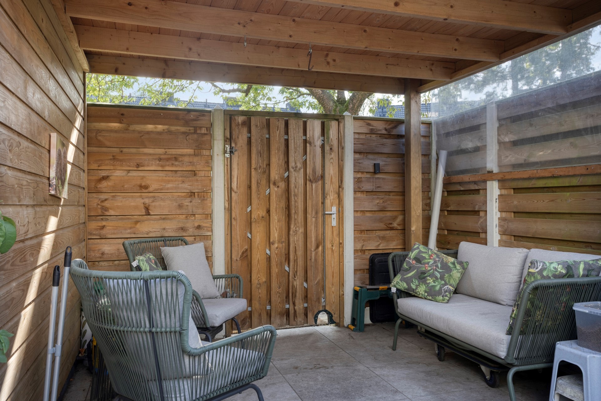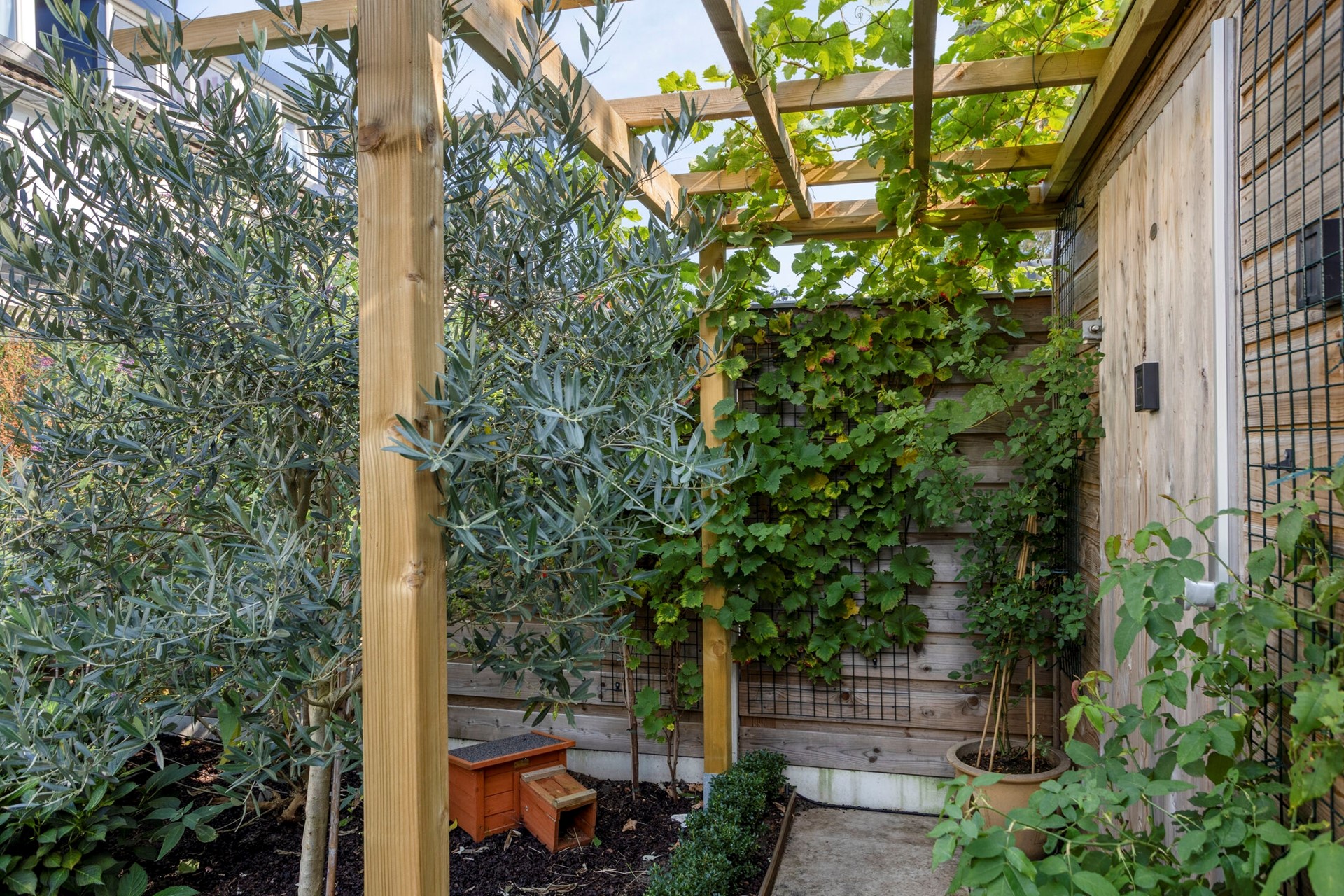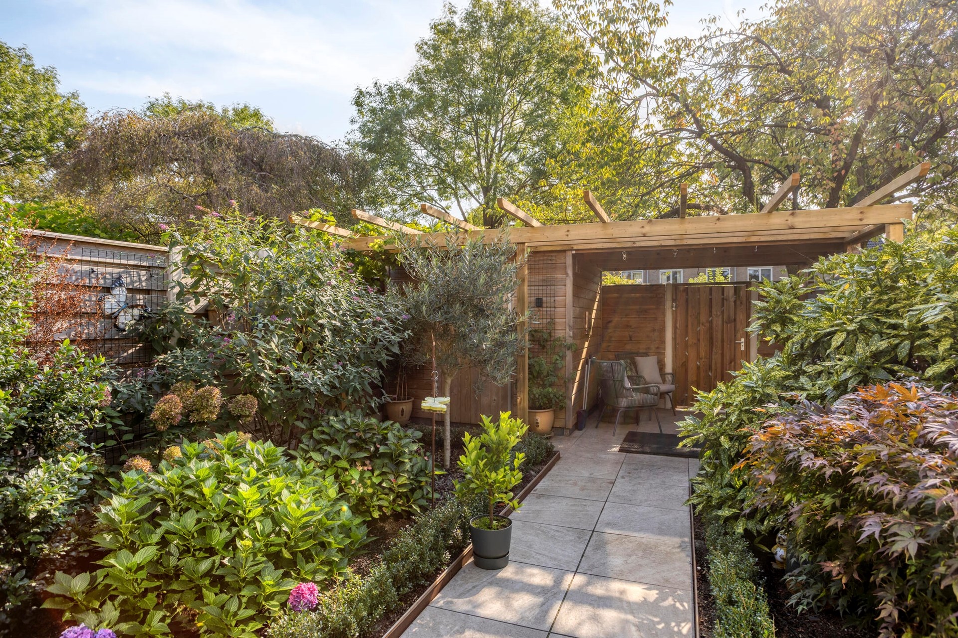 De fraai aangelegde tuin is voorzien van een houten berging met veranda en tevens van een achterom. De tuin is volledig op het zuiden gelegen dus optimaal plezier van de zonuren.