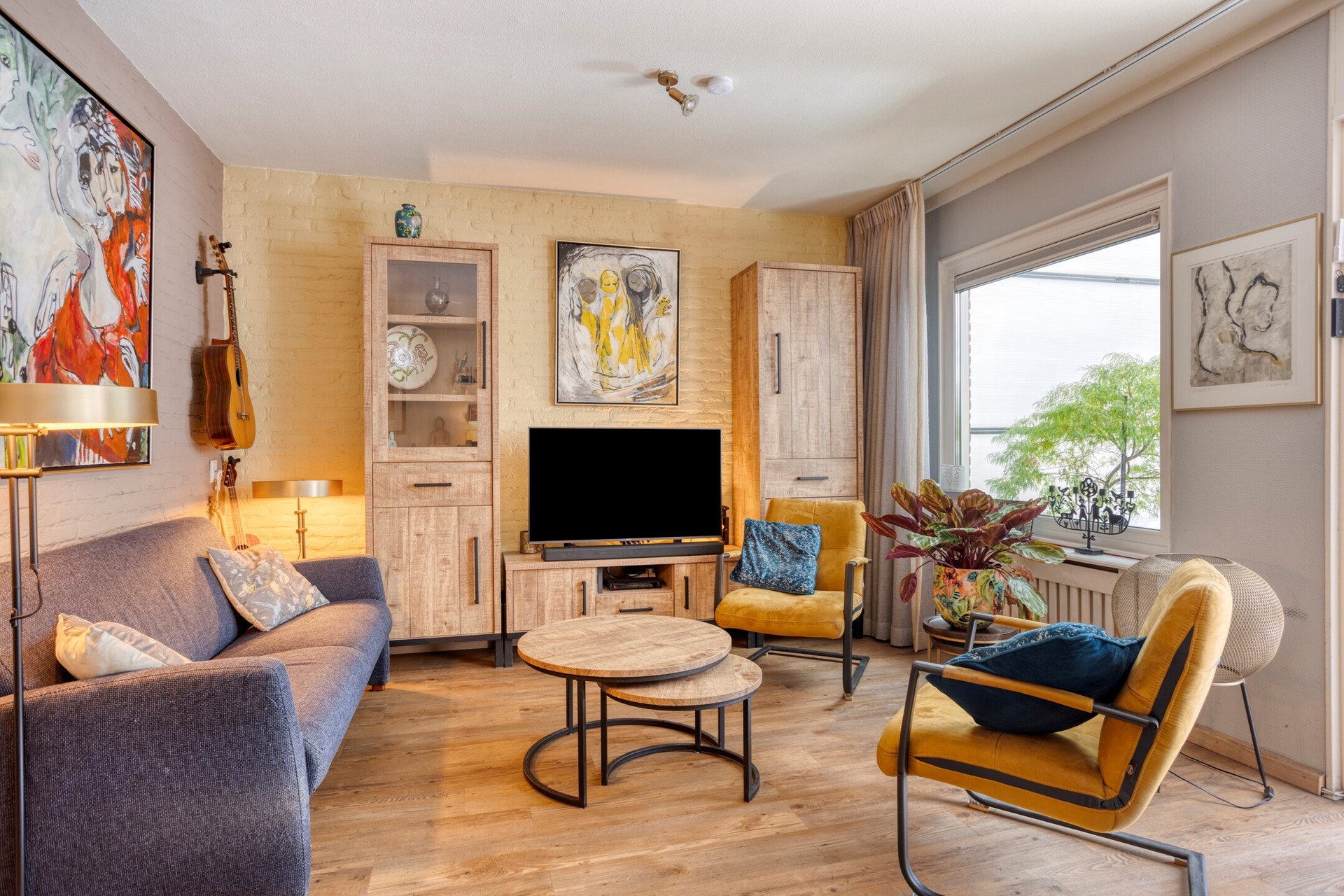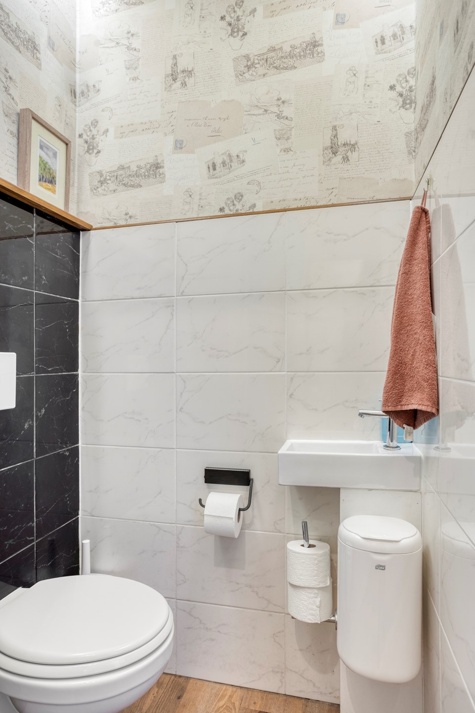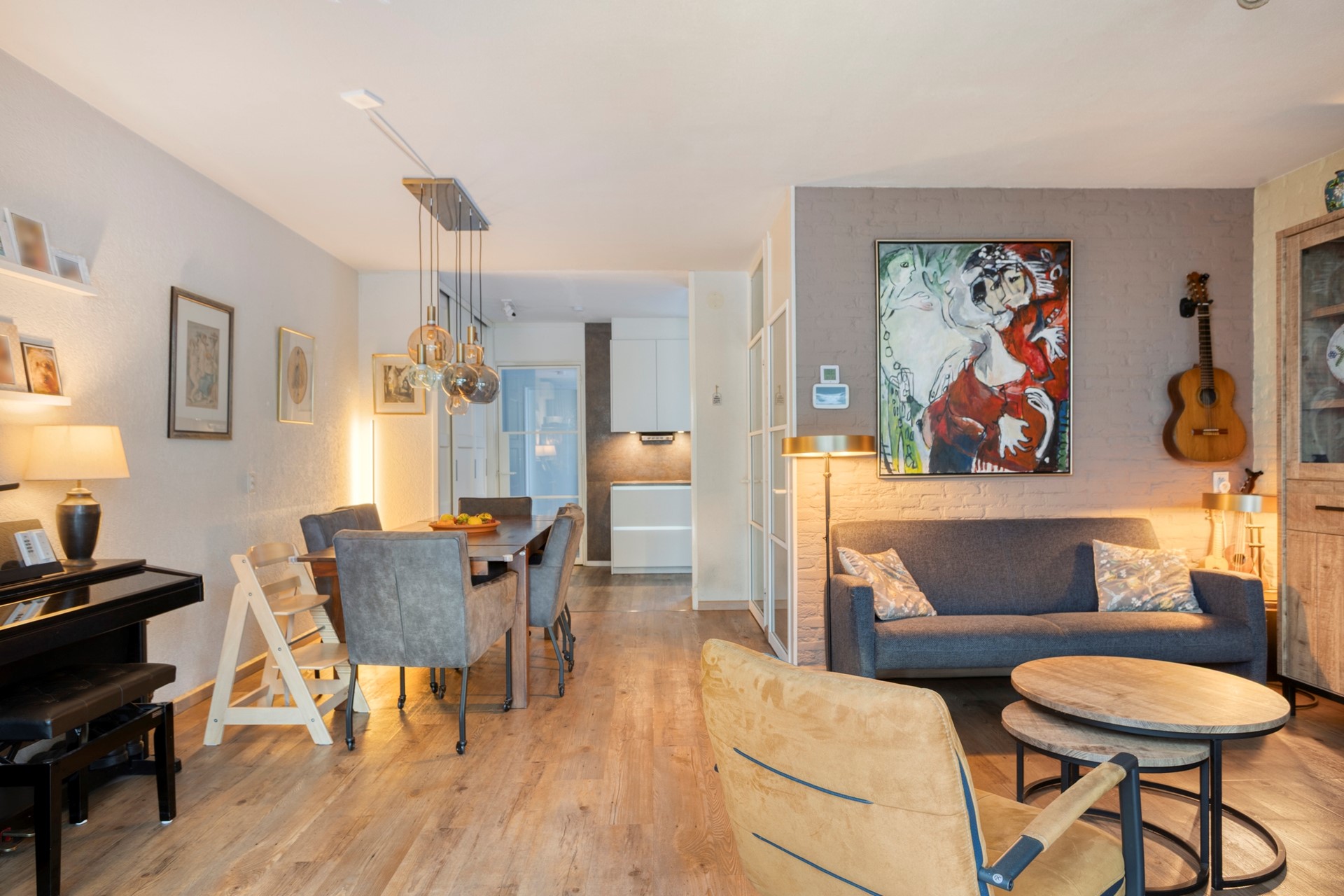 Toegang tot de living welke bestaat uit een fijn eetgedeelte en een zitgedeelte. Moderne U-vormige halfopen keuken welke voorzien is van de gebruikelijke (inbouw)apparatuur (alleen de magnetron is ingebouwd, de vaatwasser, koelkast en inductiefornuis zijn niet ingebouwd maar wel voor overname beschikbaar). Ook is hier nog een schuifdeurkast met bergruimte en de meterkast aanwezig. Via een kleine hal toegang tot het moderne toilet met fonteintje en de trap.