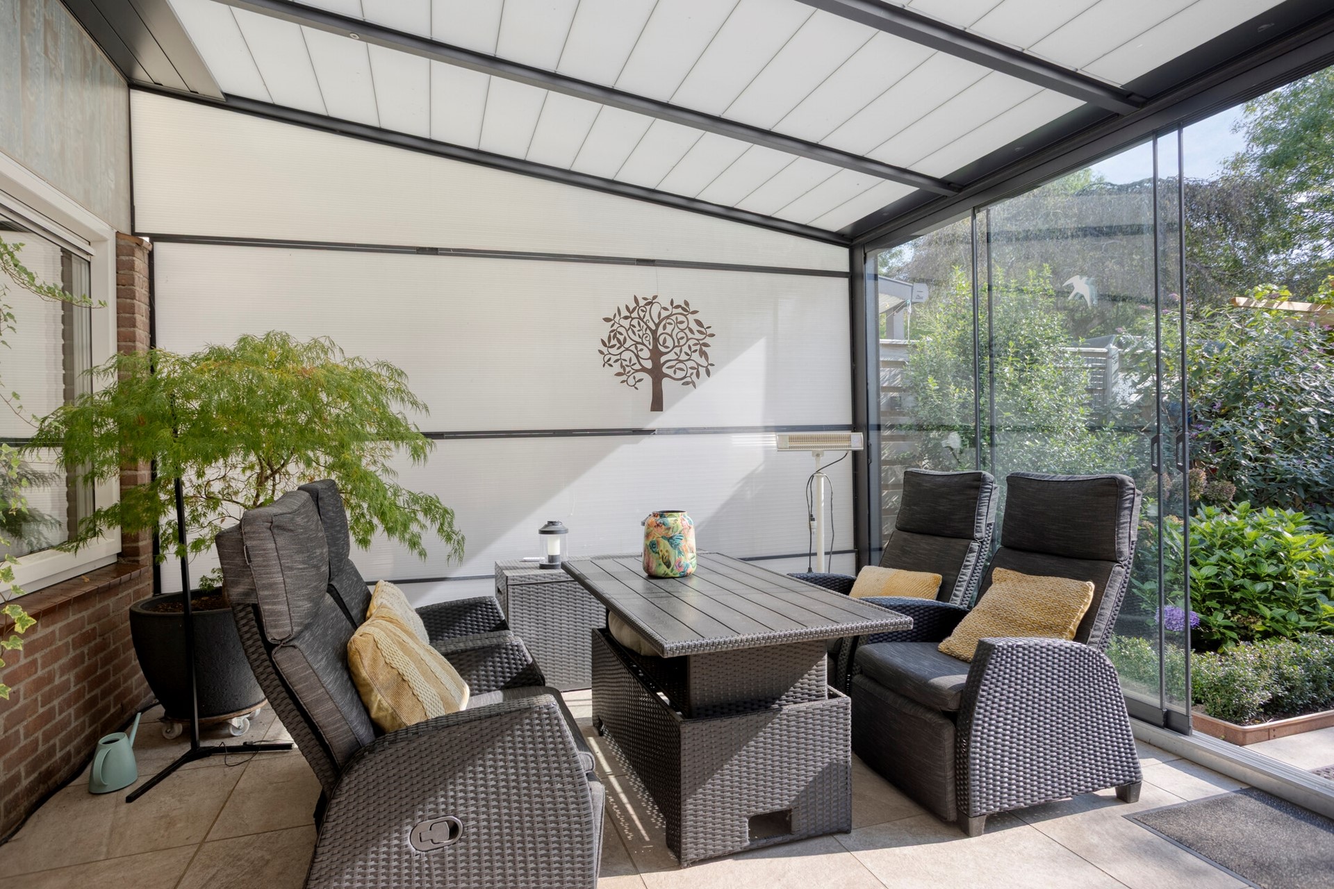 Beneden aangekomen stap je vanuit de woonkamer zo de serre in middels een schuifpui. Deze fraaie glazen serre is het gehele jaar te gebruiken, is een extra aanvulling op de woonkamer en brengt binnen en buiten samen.