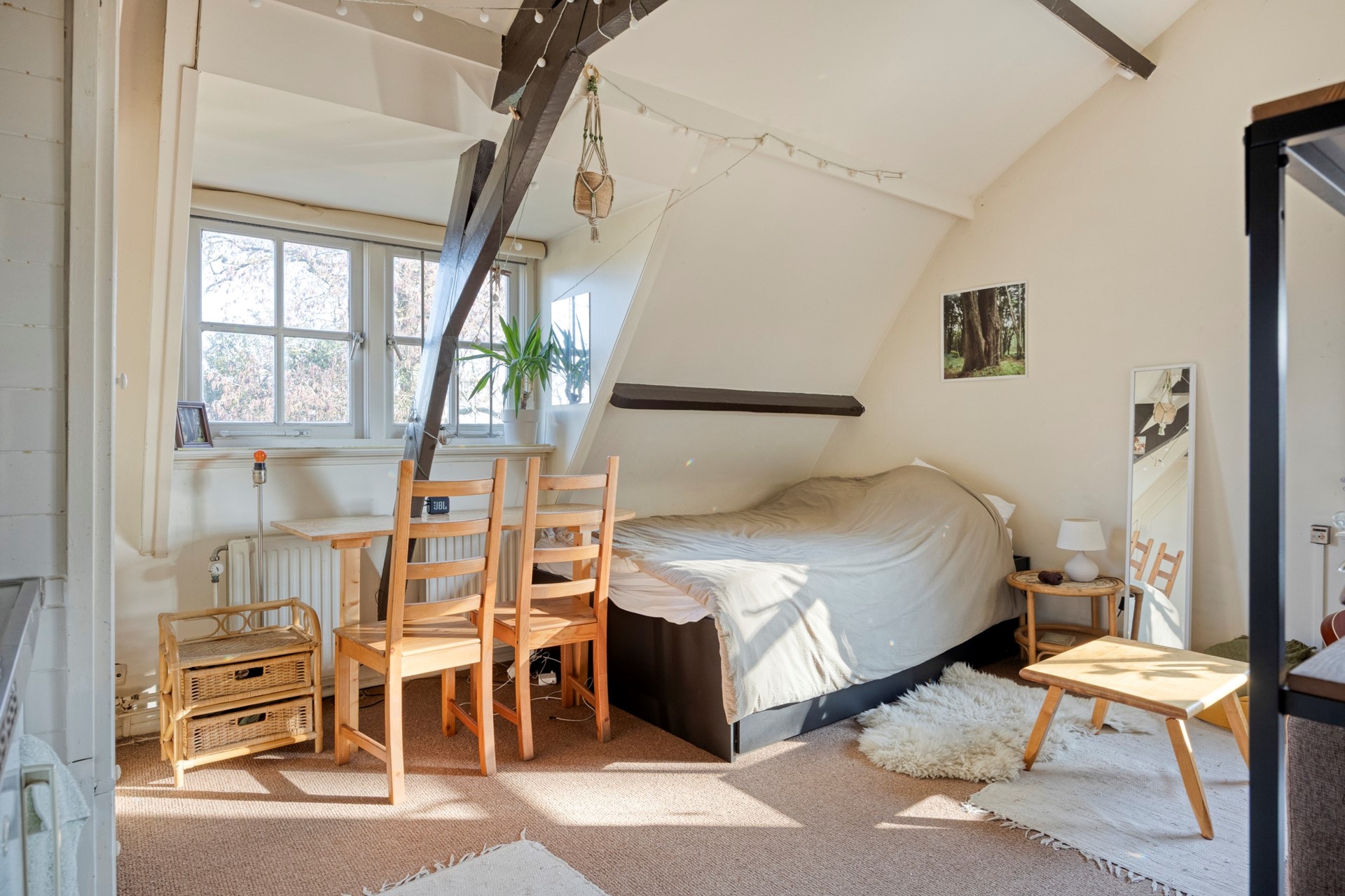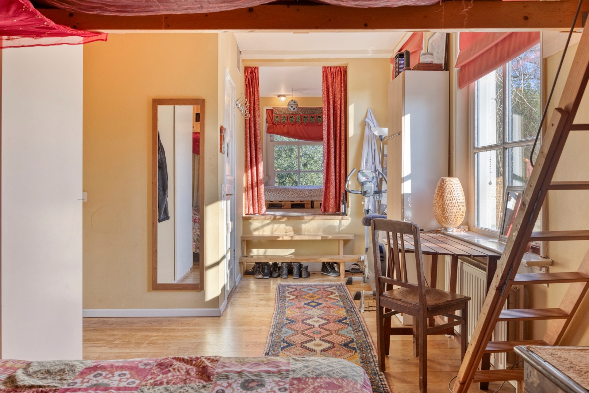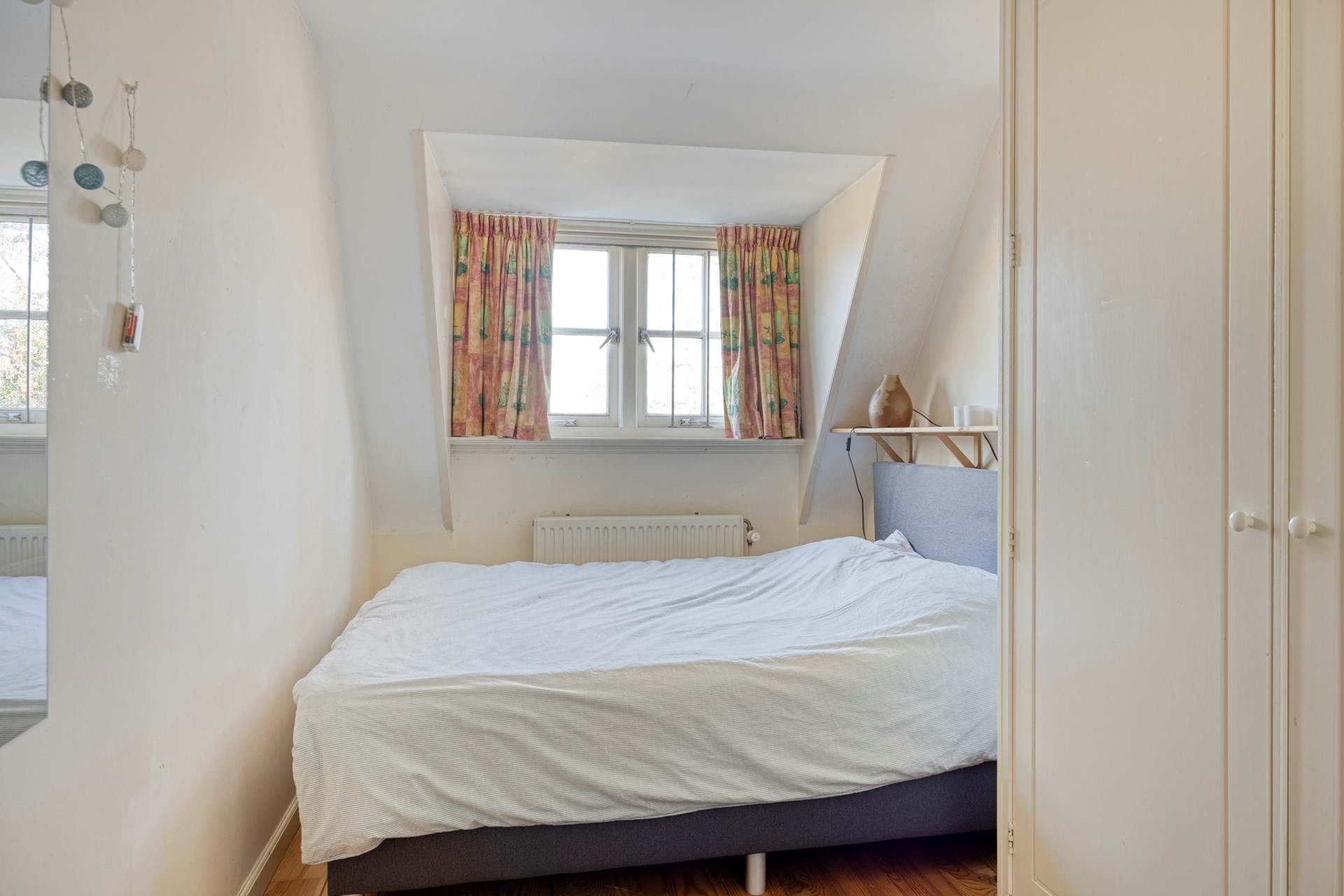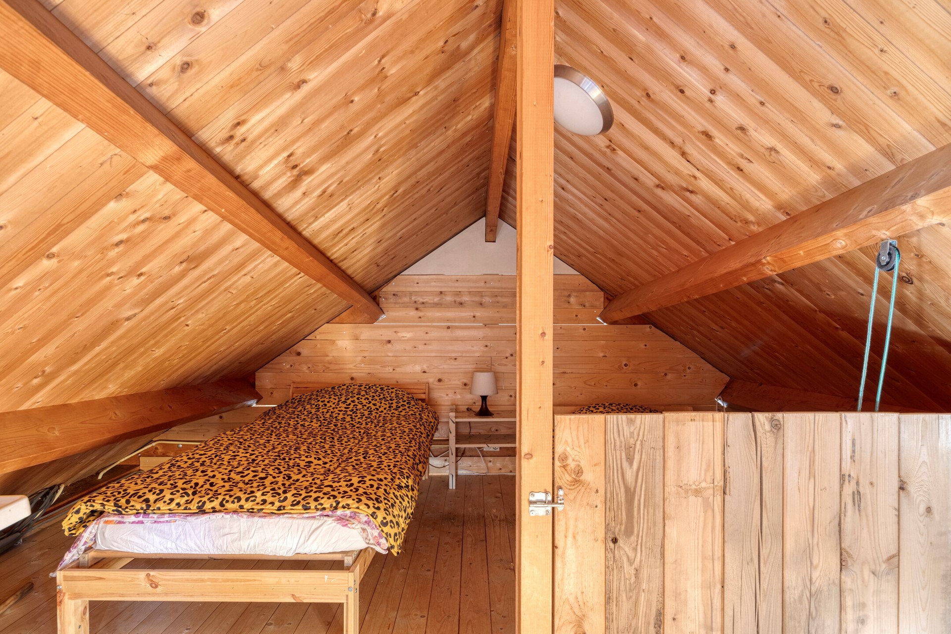 Via een tweede gang bereik je de slaapkamer, een tweede slaapkamer en een badkamer met douche, toilet en wastafel. Het object is voorts nog voorzien van een vliering.