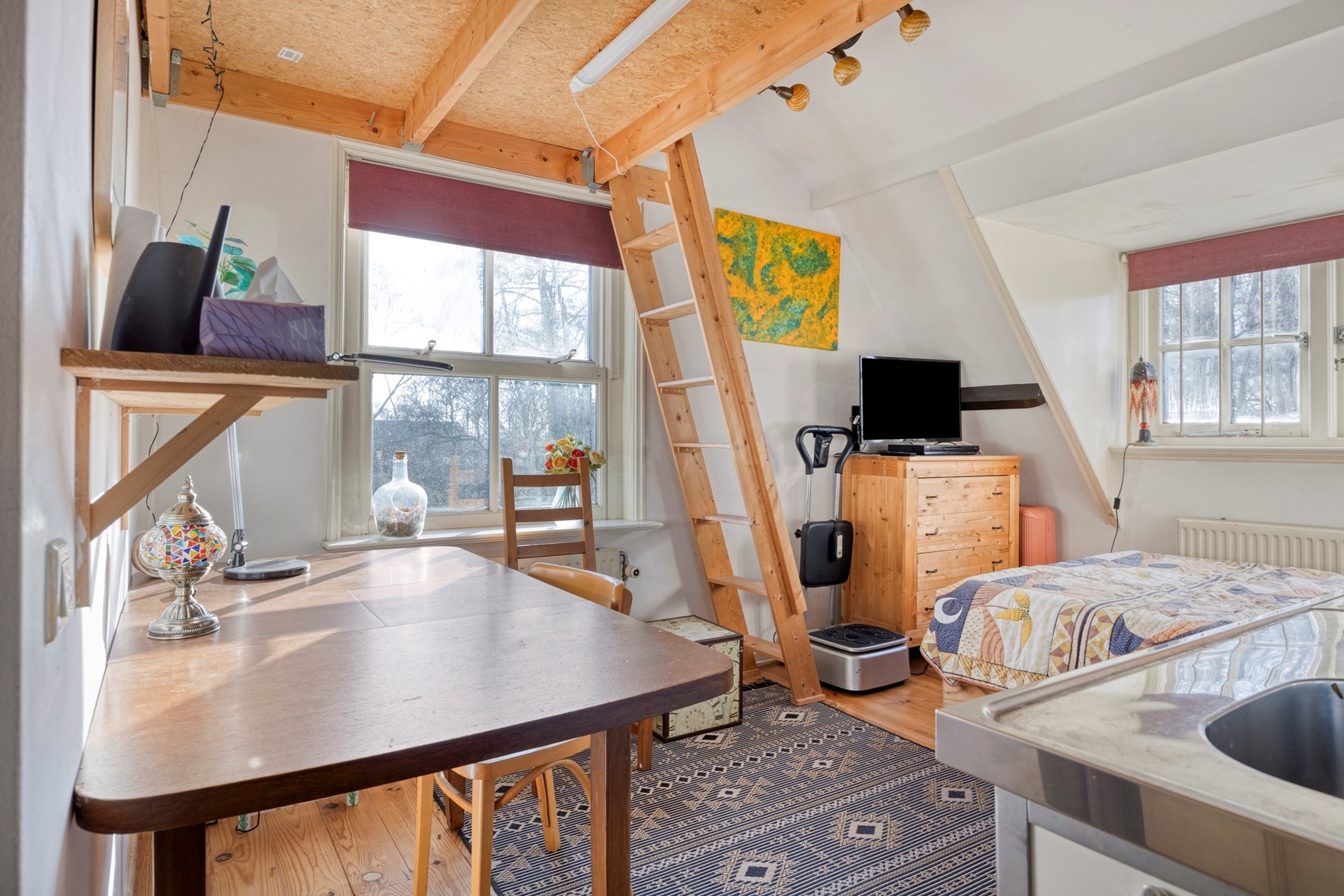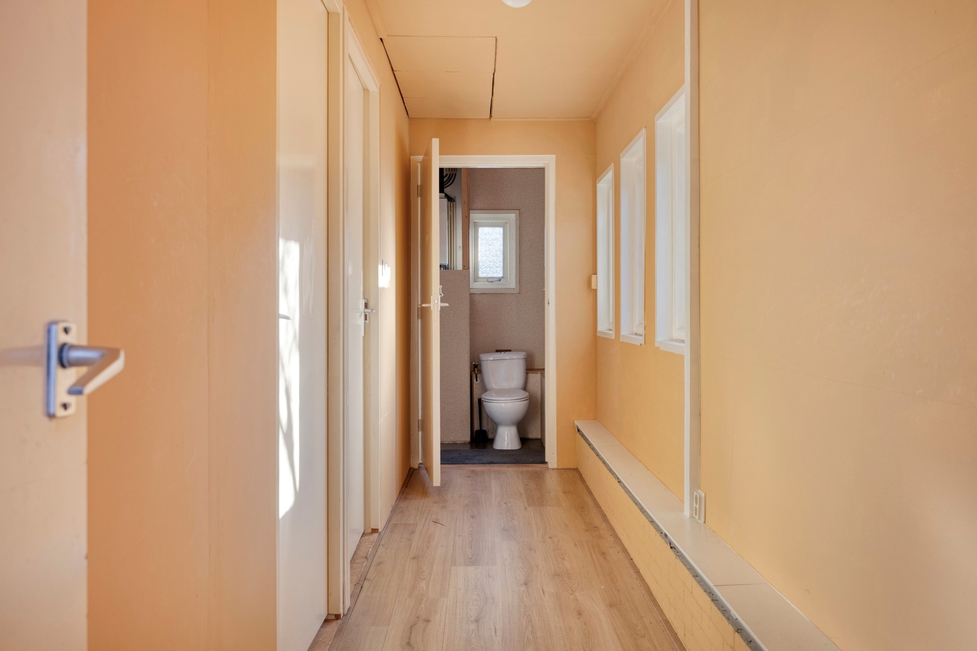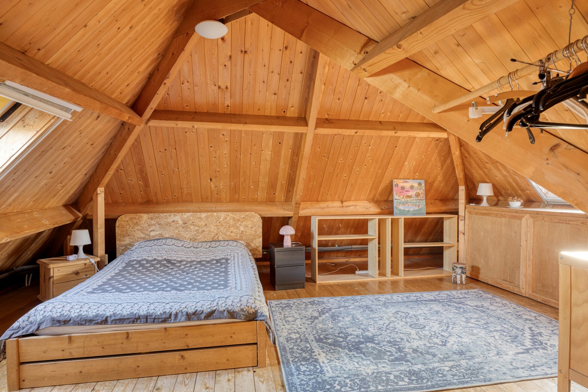 Via een tweede gang bereik je de slaapkamer, een tweede slaapkamer en een badkamer met douche, toilet en wastafel. Het object is voorts nog voorzien van een vliering.