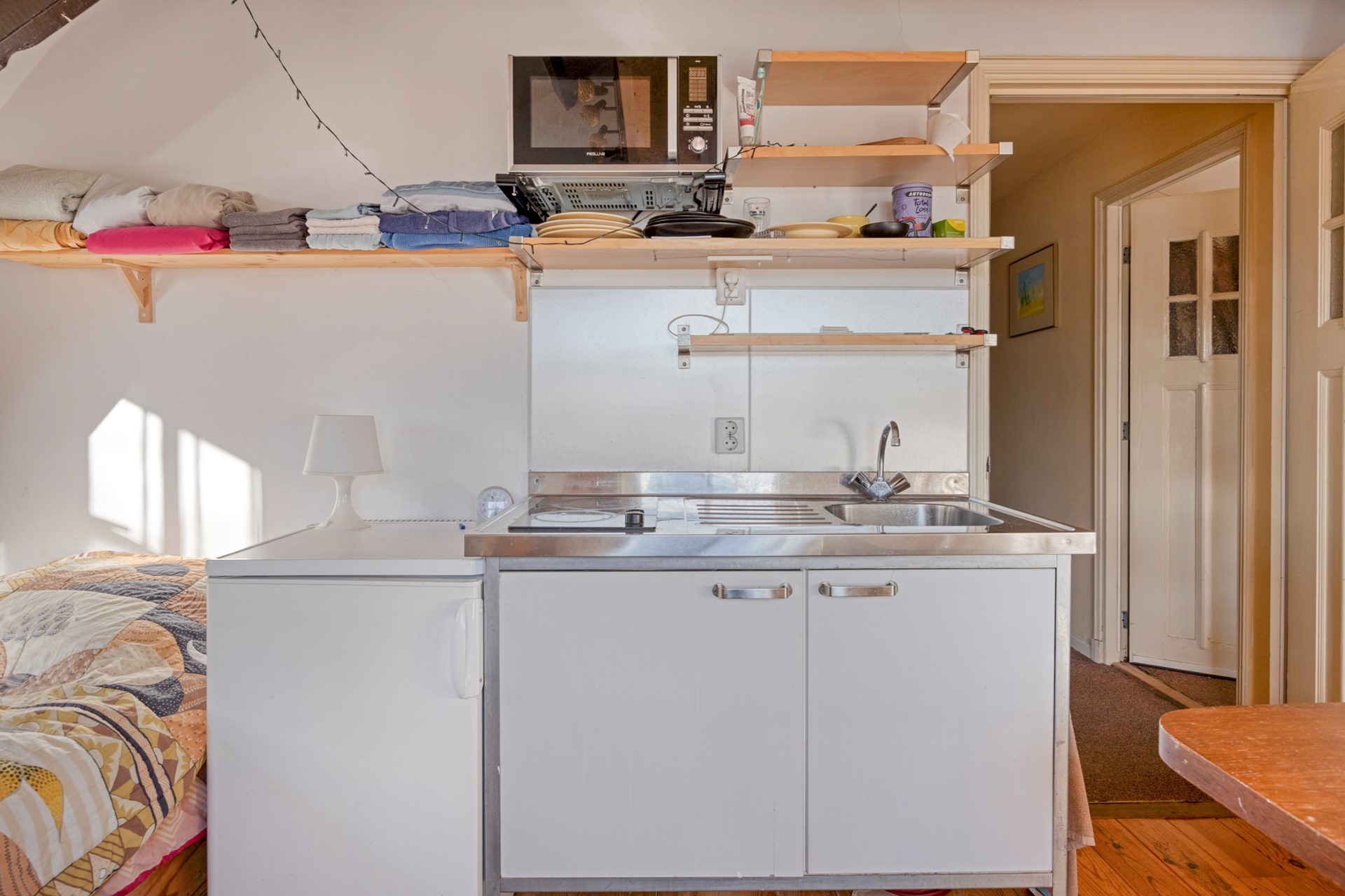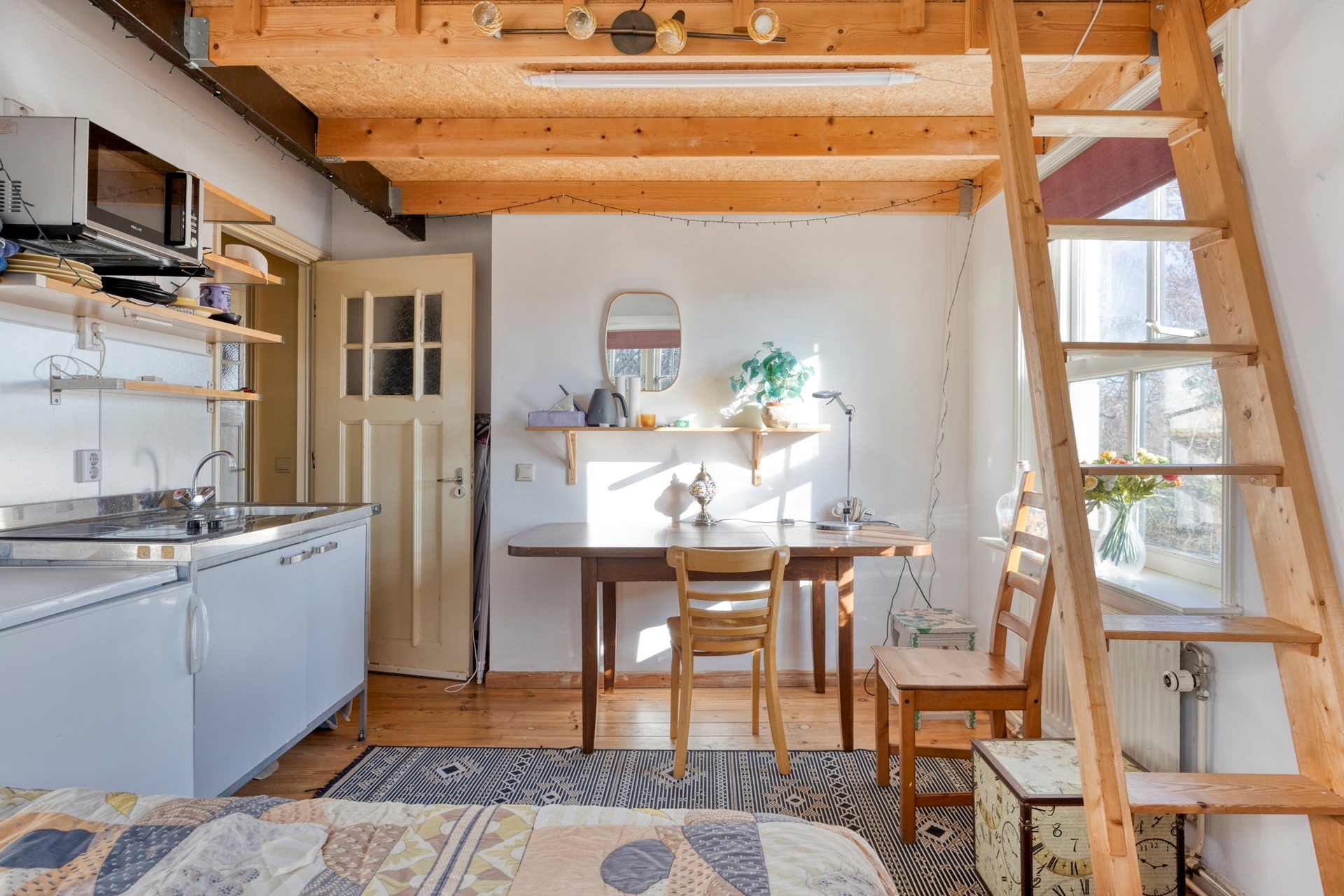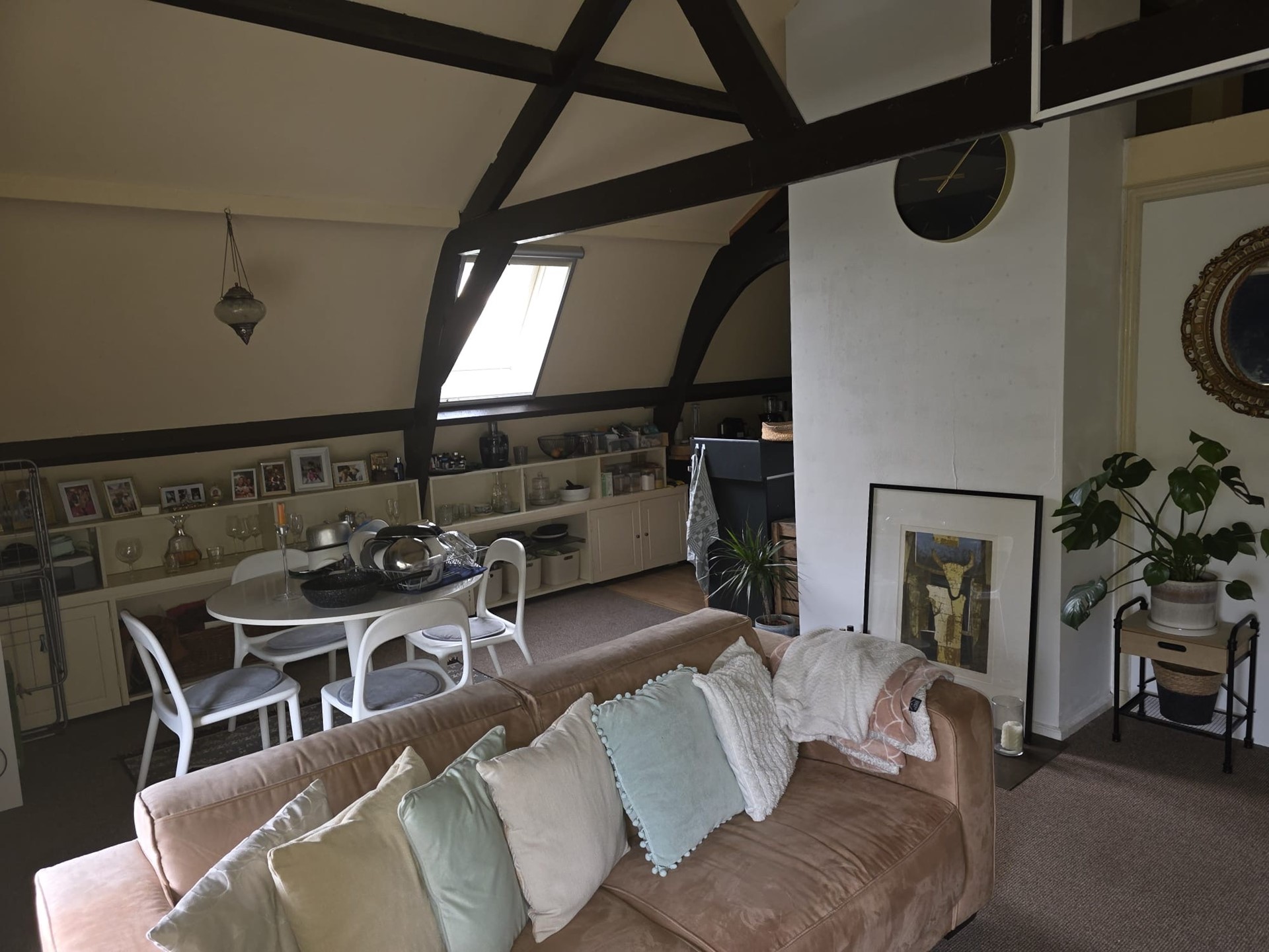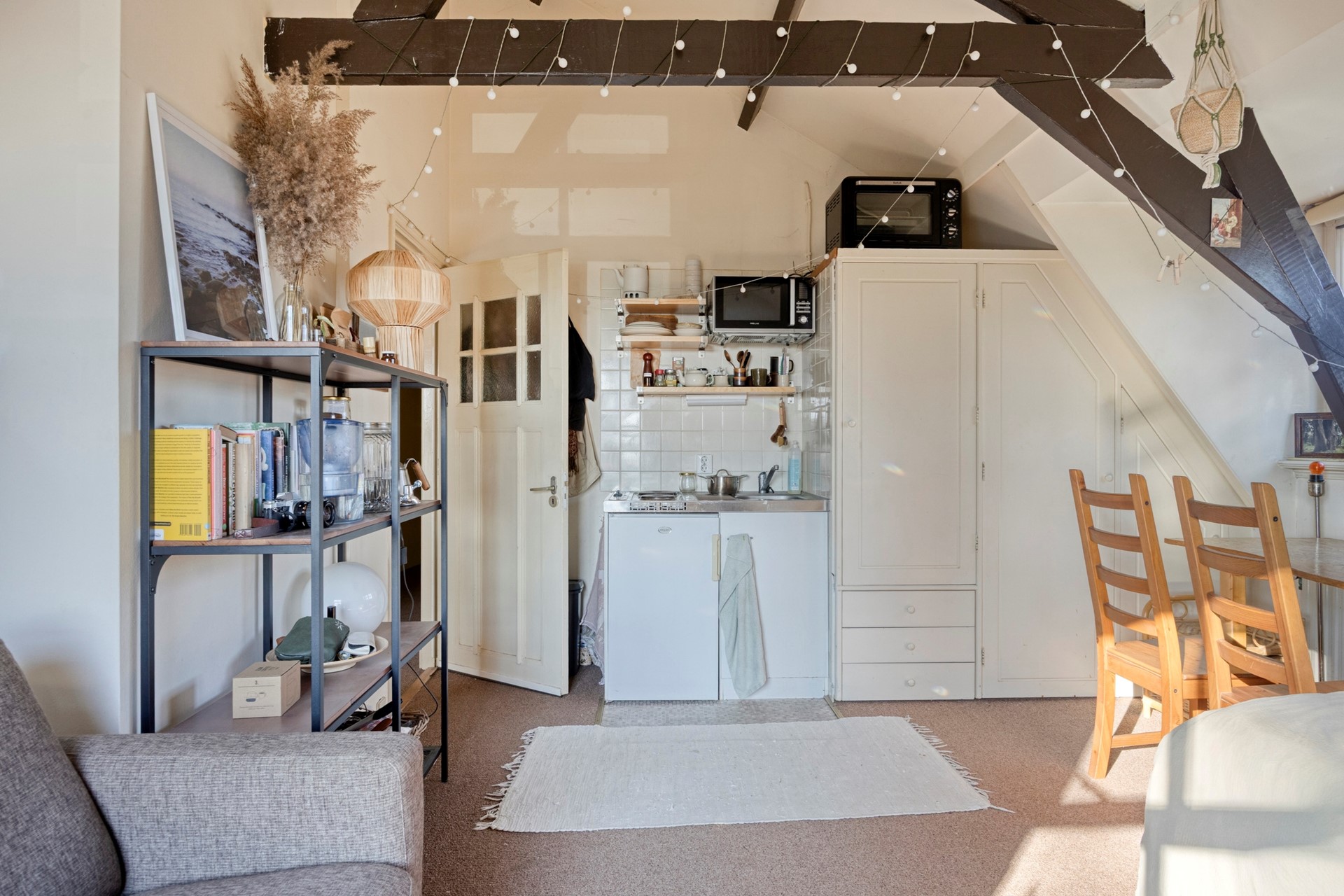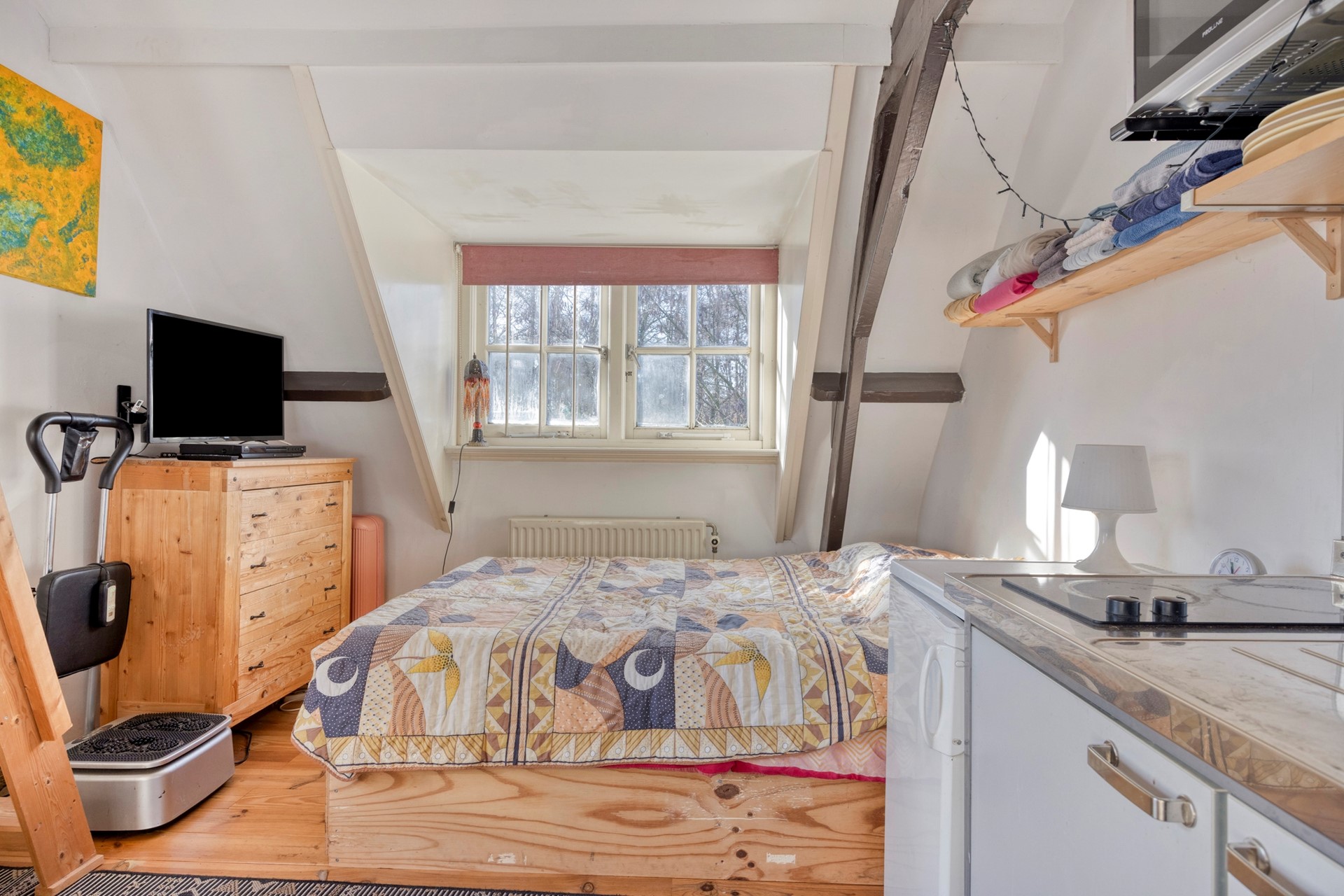 Eerste verdieping: overloop, berging, royale ruimte welke thans ingedeeld is als een appartementje met woonkamer, keukentje en badkamer met douche, toilet en wastafel.