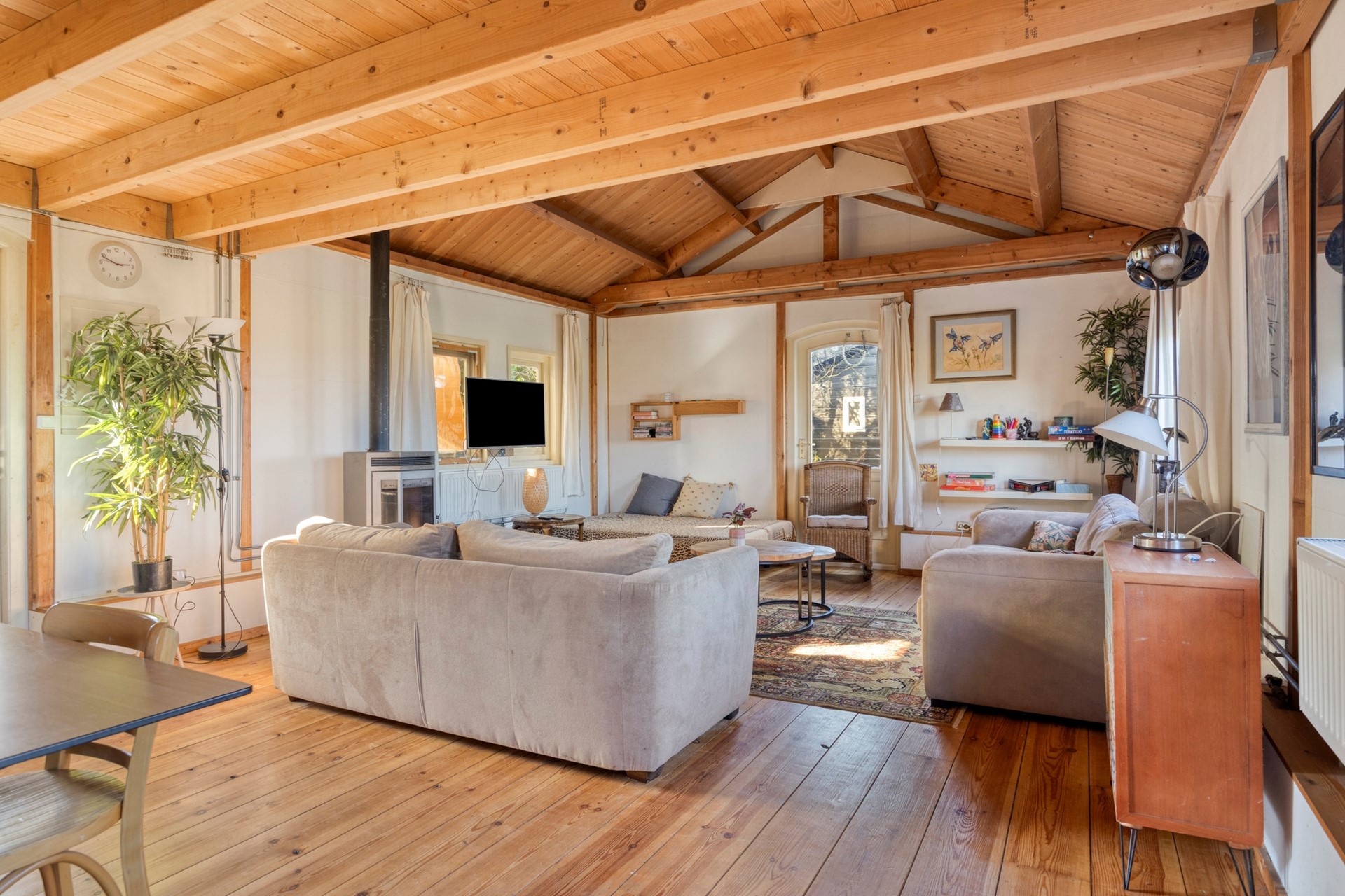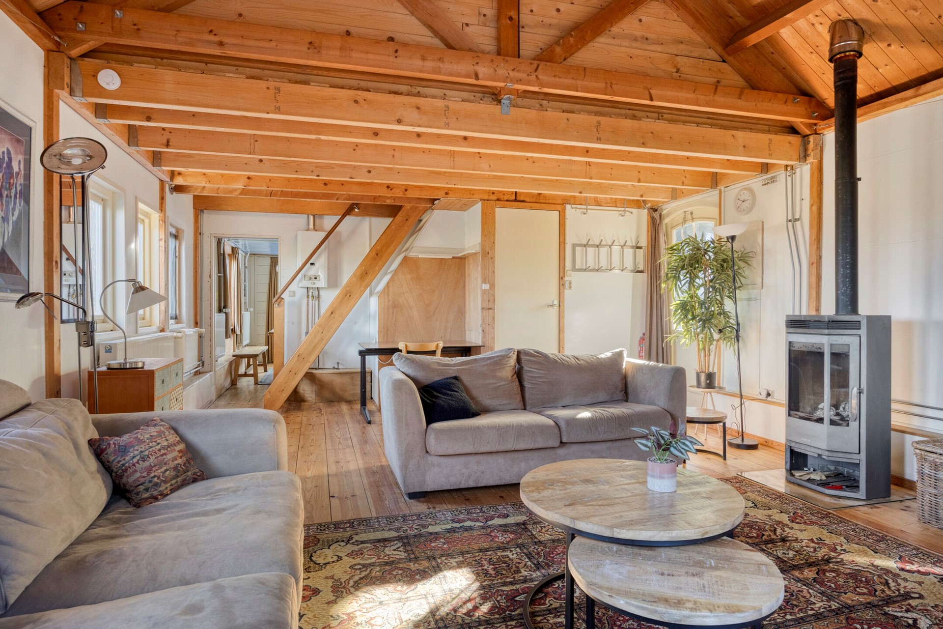 Het gastenverblijf heeft meerdere toegangsmogelijkheden maar we nemen nu voor het gemak die bij de veranda. Ruime woon/eetkamer met houtkachel, toegang tot de gezellige (woon)keuken met inbouwapparatuur waaronder een inductiekookplaat, toegang tot de slaapkamer. De badkamer ligt ook op de begane grond en is voorzien van een douche, toilet en wastafel. Ook is er op de begane grond nog een berging met opstelplaats voor wasmachine en wasdroger. De tweede verdieping, welke toegankelijk is middels een vaste houten trap, heeft een slaapkamer en nog een kleine slaapkamer.