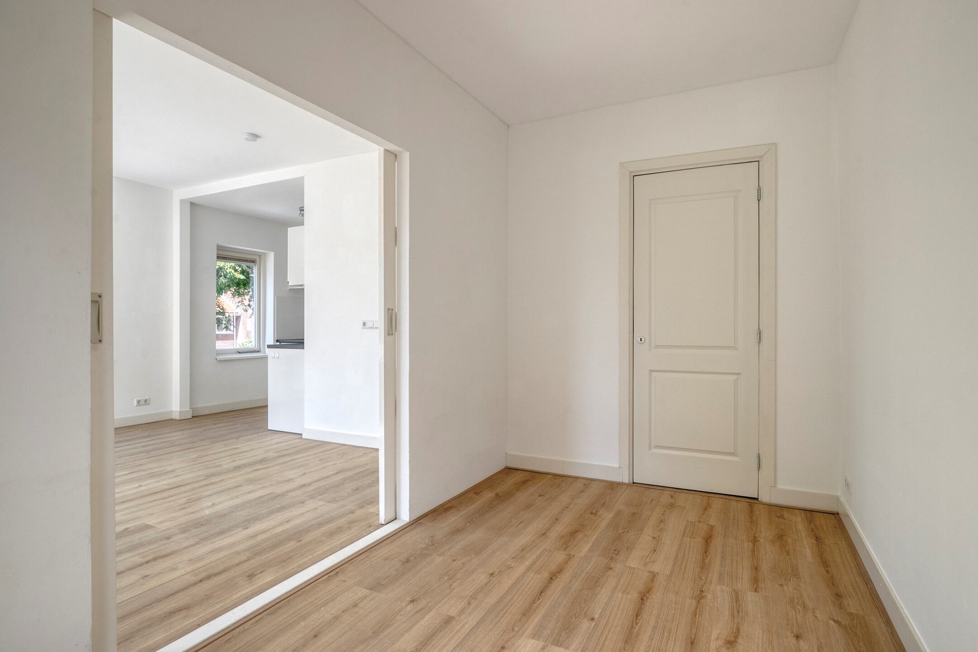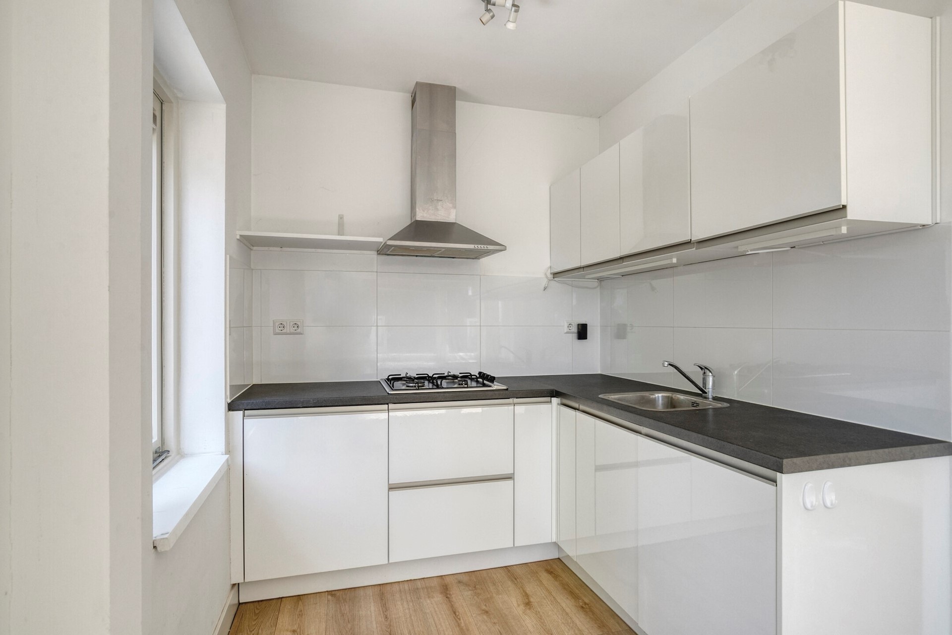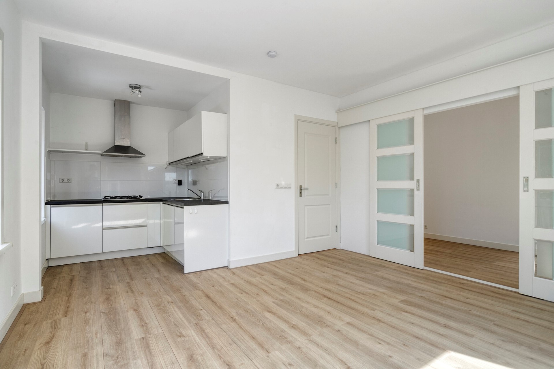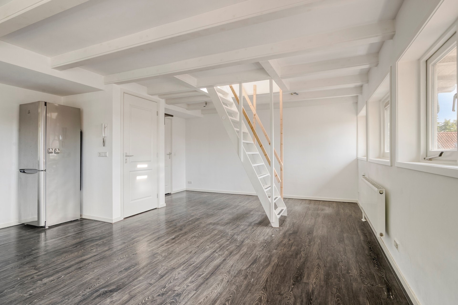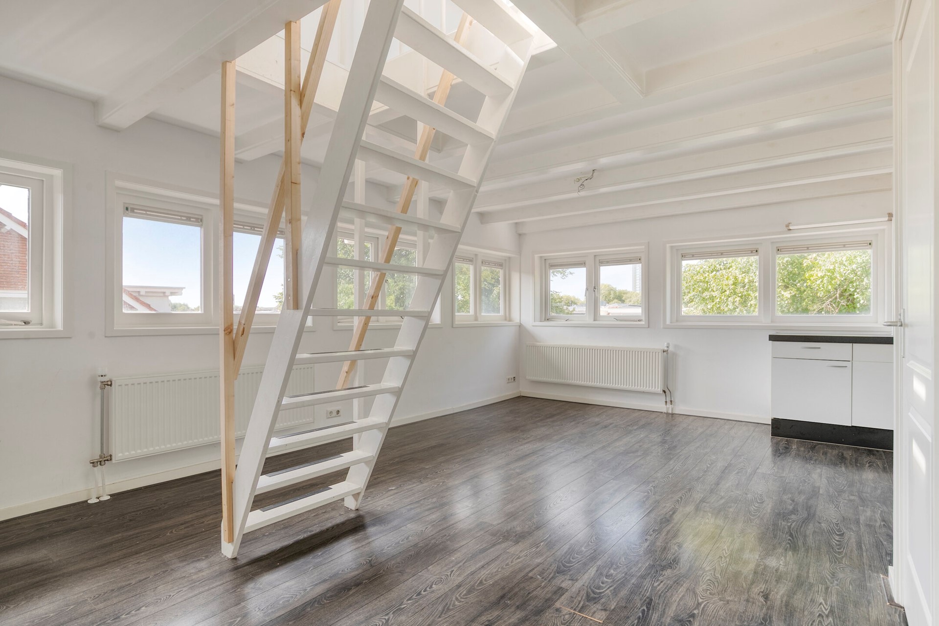 Tweede verdieping: overloop en ook hier is weer een royale (woon)kamer aanwezig met eveneens een open keuken met (inbouw)apparatuur. Ruim en modern toilet met fonteintje.