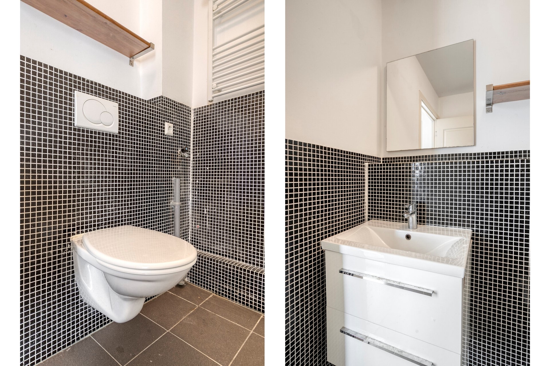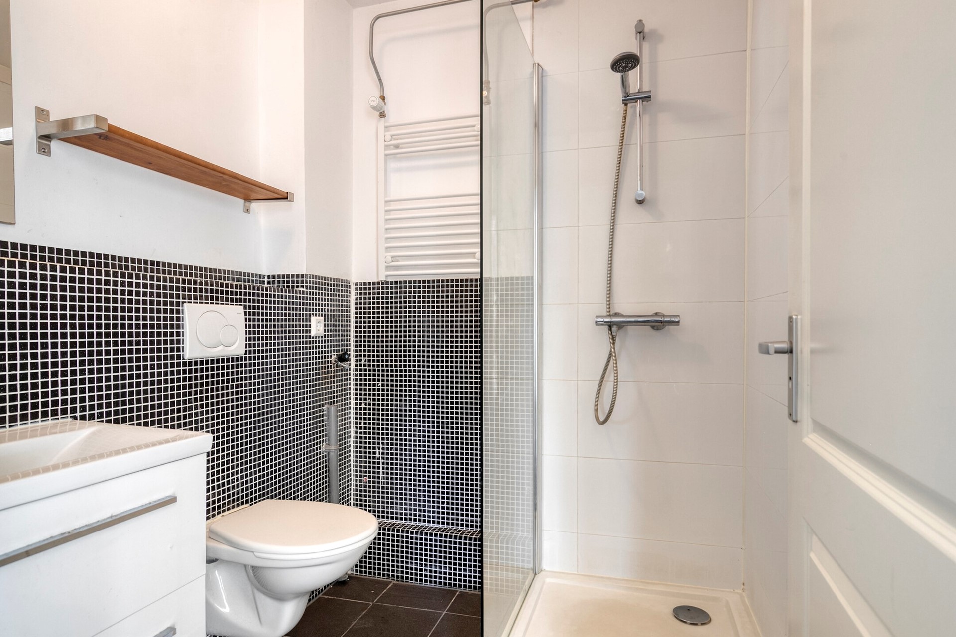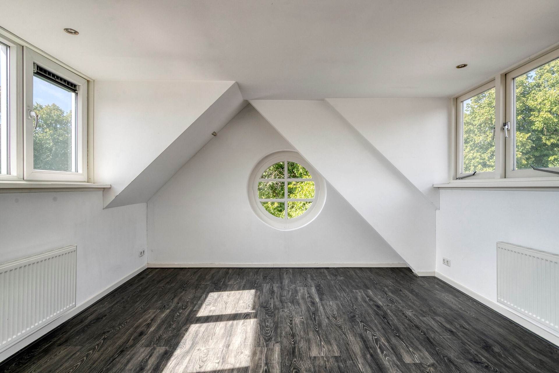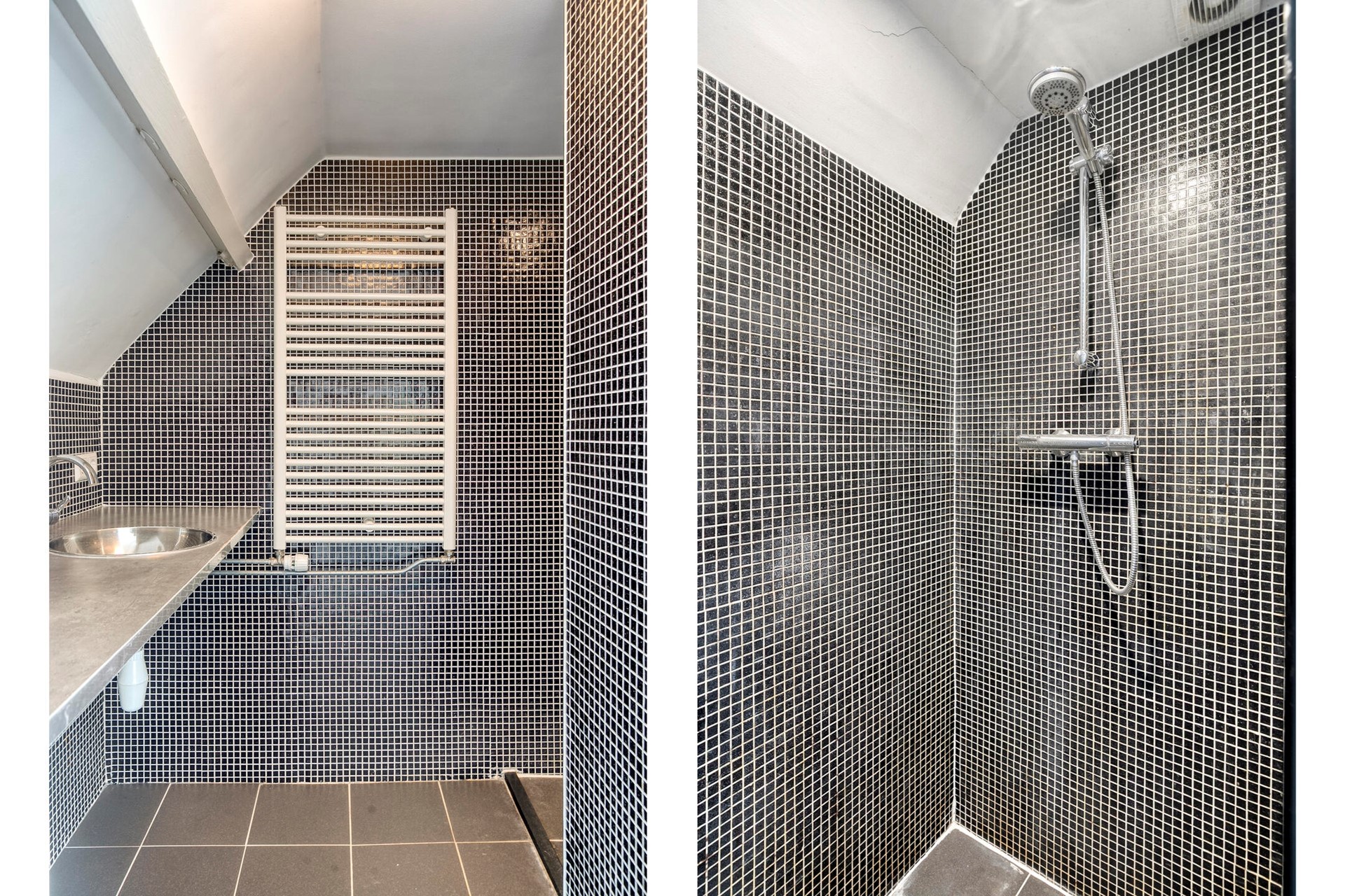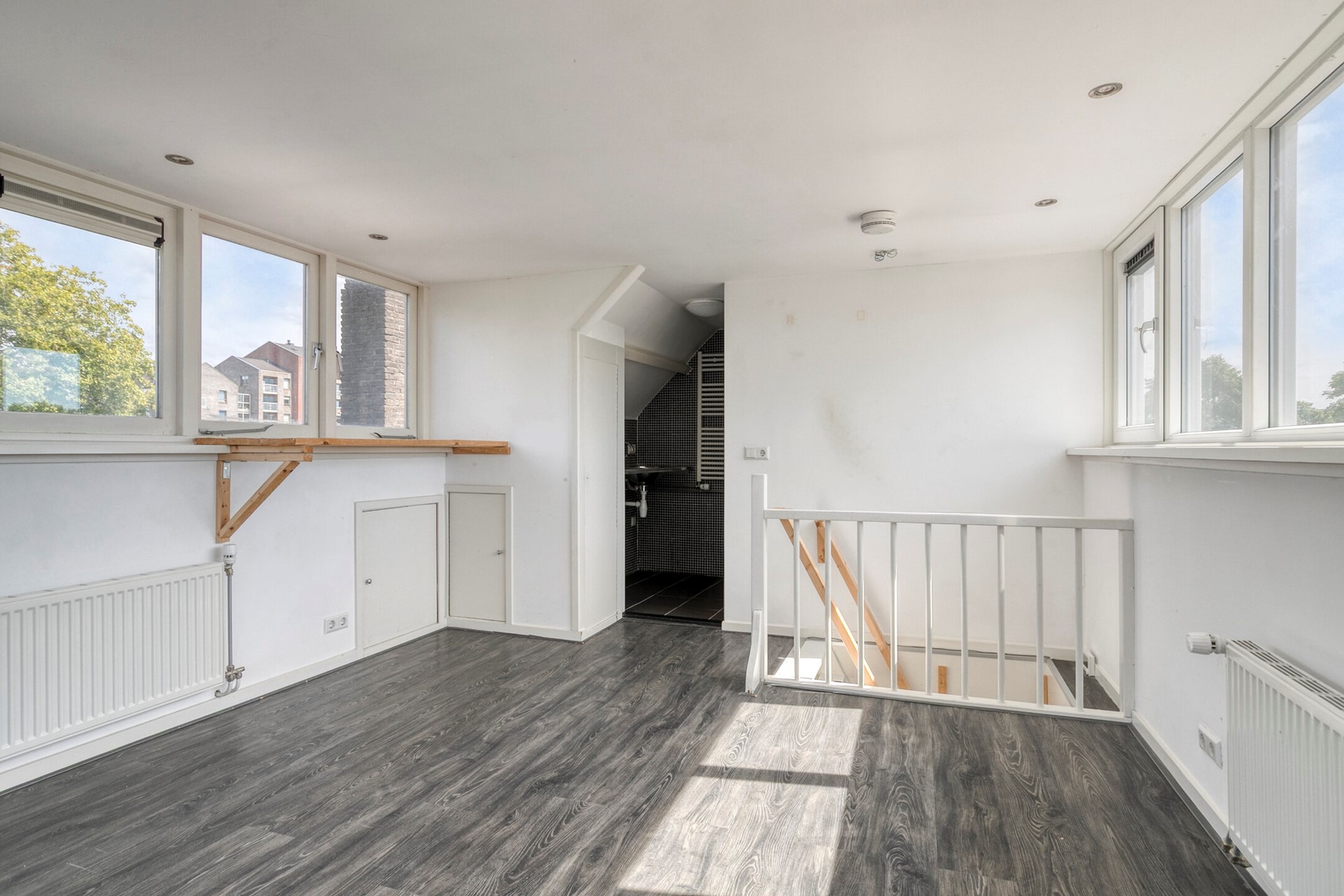 Derde verdieping: ruime slaapkamer met 2 dakkapellen, moderne badkamer met douche, wastafel en designradiator.