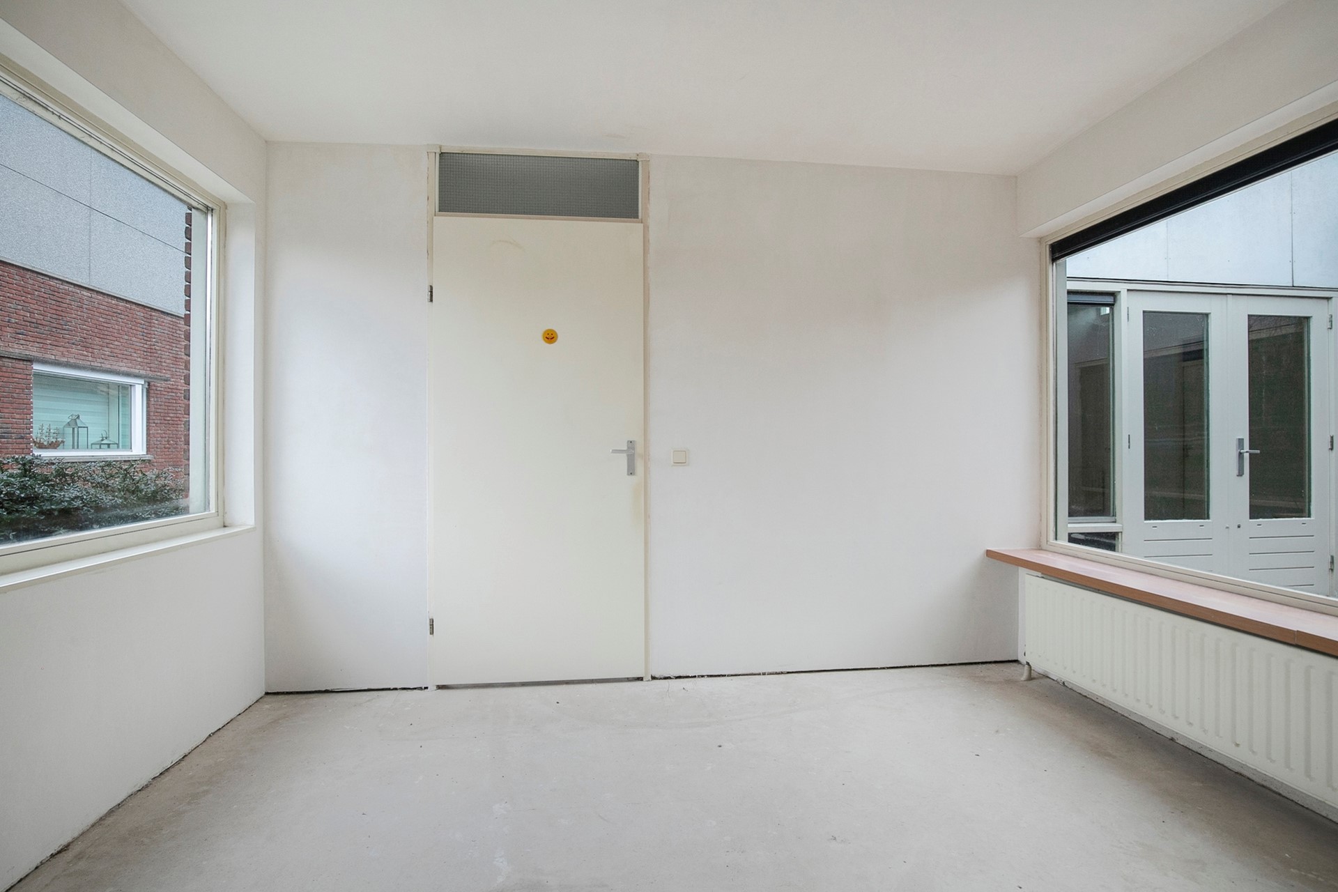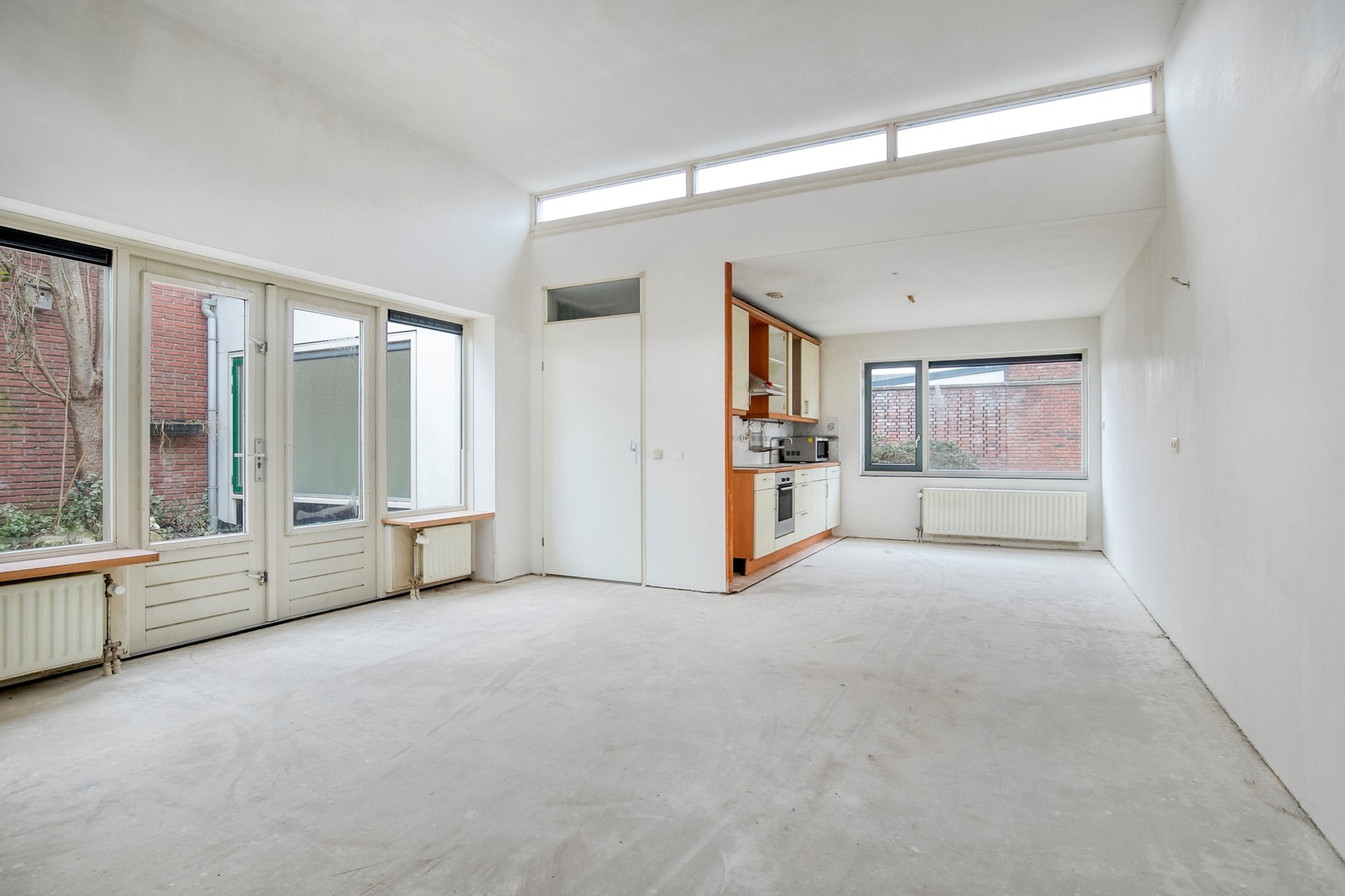 De living vormt het hart van de woning – een open, lichte ruimte met meerdere ramen en een prettig uitzicht op de patio. De open keuken is thans voorzien van een eenvoudig keukenblok.